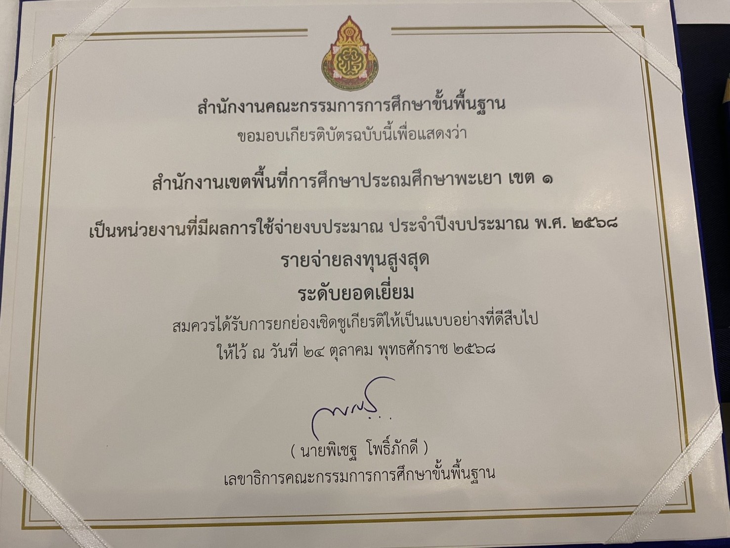 วันเสาร์ ที่ ๒๕ ตุลาคม ๒๕๖๘ ดร.ธงชัย คำปวง ผู้อำนวยการสำนักงานเขตพื้นที่การศึกษาประถมศึกษาพะเยา เขต ๑ รับโล่รางวัลหน่วยงานที่มีผลการใช้จ่ายงบประมาณ ประจำปีงบประมาณ พ.ศ. ๒๕๖๘ รายจ่ายลงทุนสูงสุด ระดับยอดเยี่ยม มอบโดย นายพิเชฐ โพธิ์ภักดี เลขาธิการคณะกรรมการการศึกษาขั้นพื้นฐาน ณ โรงแรมเดอะ คาวาลิ คาซ่า รีสอร์ท จังหวัดพระนครศรีอยุธยา