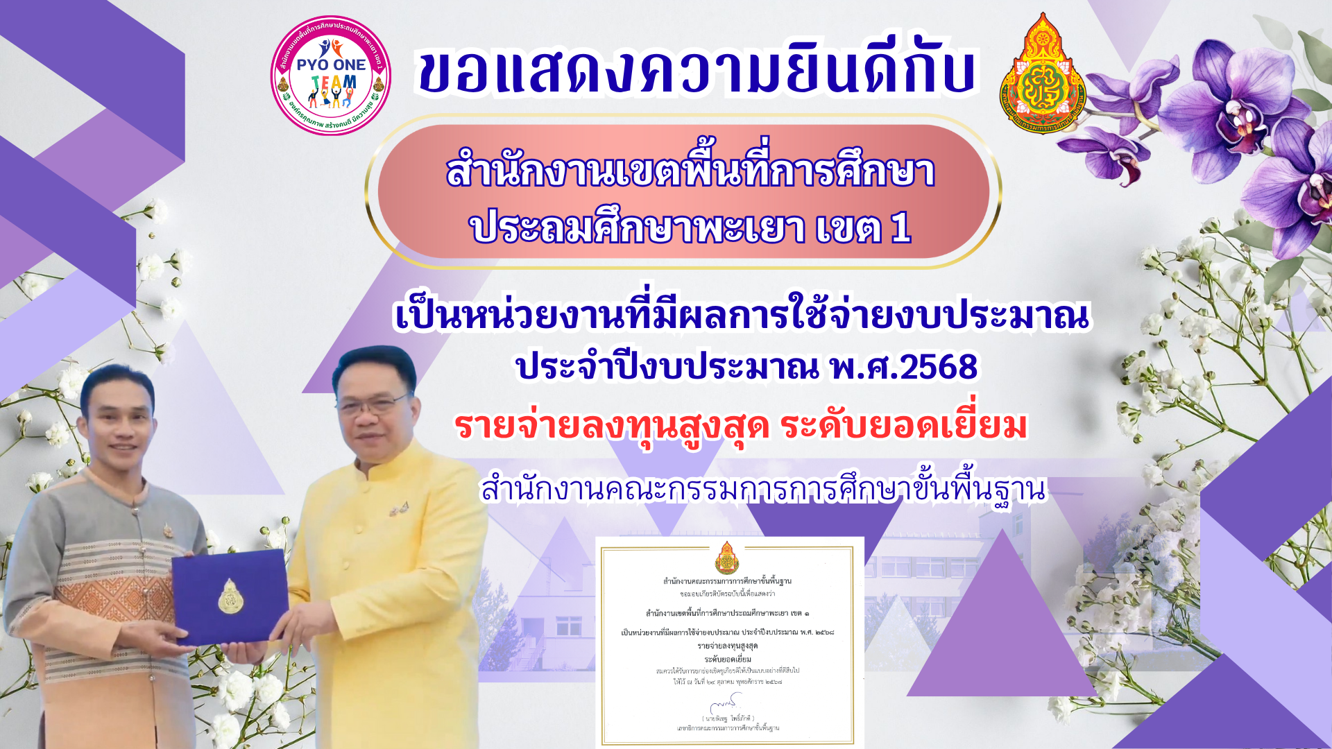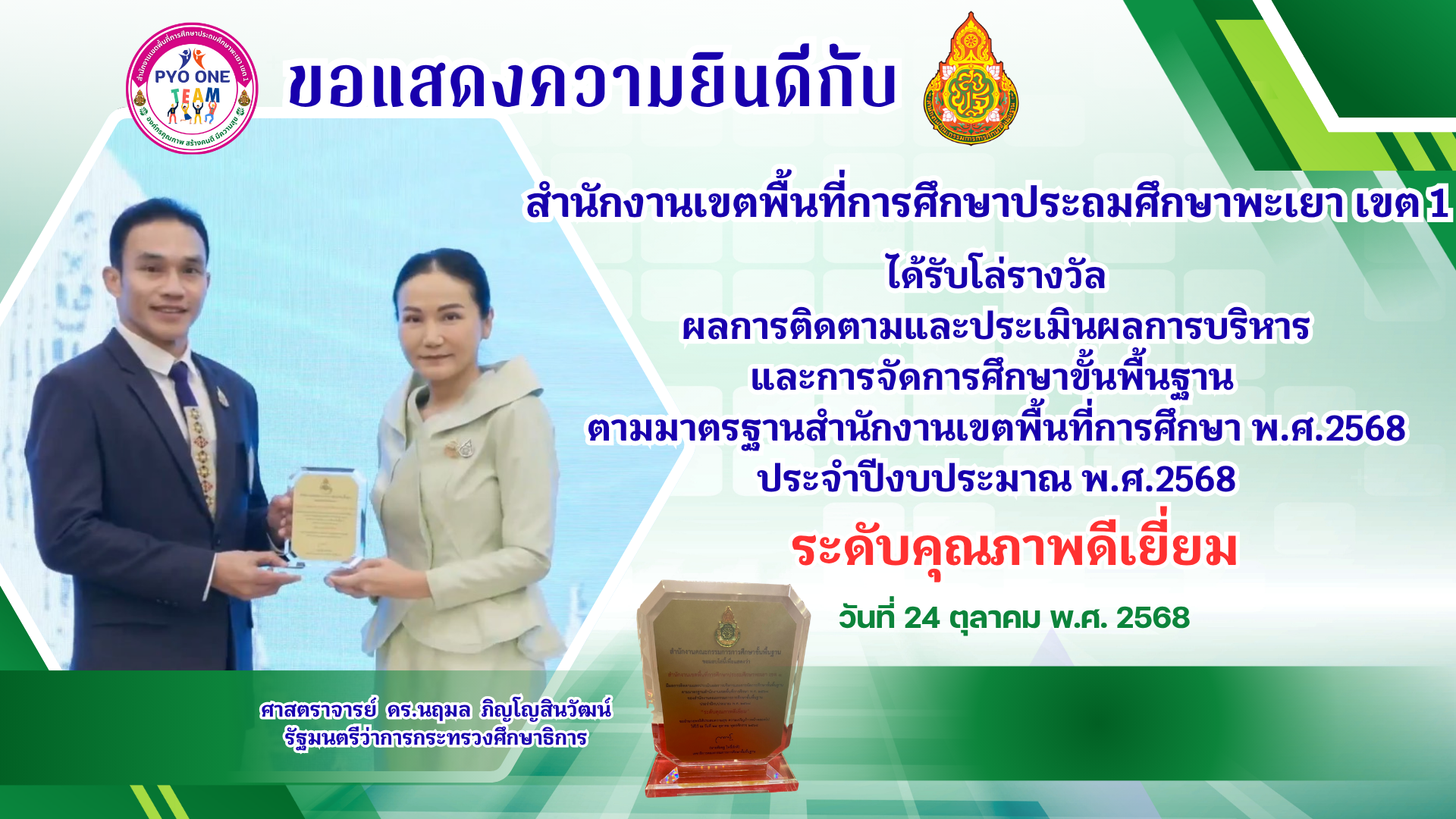 วันเสาร์ ที่ ๒๕ ตุลาคม ๒๕๖๘ ดร.ธงชัย คำปวง ผู้อำนวยการสำนักงานเขตพื้นที่การศึกษาประถมศึกษาพะเยา เขต ๑ รับโล่รางวัลหน่วยงานที่มีผลการใช้จ่ายงบประมาณ ประจำปีงบประมาณ พ.ศ. ๒๕๖๘ รายจ่ายลงทุนสูงสุด ระดับยอดเยี่ยม มอบโดย นายพิเชฐ โพธิ์ภักดี เลขาธิการคณะกรรมการการศึกษาขั้นพื้นฐาน ณ โรงแรมเดอะ คาวาลิ คาซ่า รีสอร์ท จังหวัดพระนครศรีอยุธยา